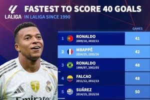全文摘要:根据德国转会市场数据,C罗以41场成为1990年后最快打入西甲40球的球员,姆巴佩42场紧随其后。罗纳尔多、法尔考、苏亚雷斯等名宿也位列榜单,展现了顶级射手在西赛的高效统治力。