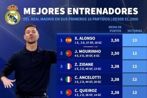 全文摘要:德国转会市场统计了2000年以来皇马主帅前16场的胜场。阿隆索以13胜高居榜首,穆里尼奥、齐达内、安切洛蒂等名帅均以12胜并列次席,展现了皇马主帅的强大开局能力。