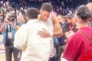 模仿布克走红的网红(CY布克☀️)在社媒上晒出与布克拥抱合影的瞬间,并写道:“我真的太幸福了、谢谢@NBA帮我圆梦。”