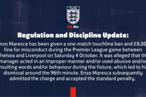 切尔西主教练马雷斯卡因在10月4日周六对阵利物浦的英超联赛中存在不当行为,被处以一场场边禁赛及8000英镑罚款。该指控指出马雷斯卡在比赛第96分钟被罚离场前,存在不当行为或使用侮辱性、攻击性言语。马雷斯卡本人已承认指控并接受标准处罚。