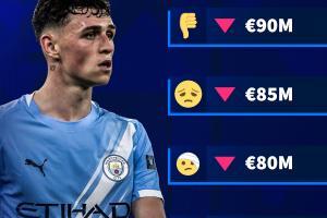 全文摘要:据德转预告,福登身价将下跌,最多跌至7500万欧元。这将是其连续第四次身价下调,其身价已从1.5亿欧元的巅峰降至1亿欧元。本赛季他仅英超5场1球,足坛身价过亿球员或将再少一位。