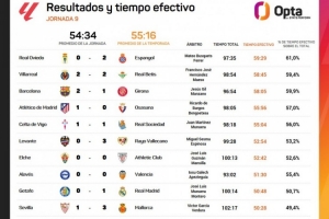 全文摘要:OPTA统计显示,西甲第九轮所有比赛的有效时间均未超过60分钟,最低的塞维利亚与马洛卡一战有效时间仅50分28秒。比赛有效时间占比普遍偏低,从49.4%至61%不等,反映出比赛中断频繁,实际比赛时长严重不足。