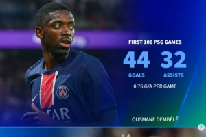 全文摘要:登贝莱巴黎生涯百场里程碑,贡献44球32助。德转数据显示,其场均参与0.76球,低于内马尔(1.29)、伊布(1.18)和姆巴佩(1.09),但优于迪马利亚(0.73)和卡瓦尼(0.65)。