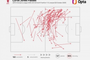 此役柯蒂斯-琼斯为利物浦踢满全场,成功传球122次,这是2003-2004赛季Opta统计相关数据以来,利物浦球员欧冠单场成功传球纪录。