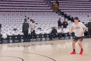 赛前,杨瀚森身穿中国红战靴进行投篮热身。