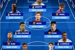 全文摘要:文章为即将到来的西班牙国家德比,盘点了皇马和巴萨球员的历史最高身价阵容。该阵总身价达14.8亿欧元,包含姆巴佩、梅西、C罗、亚马尔等巨星。维尼修斯和亚马尔以2亿欧元的身价成为阵中最高,贝林厄姆与梅西同以1.8亿欧元紧随其后。