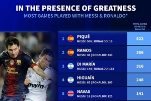 1.皮克,与梅西同场506次,与C罗同场16次,合计522次