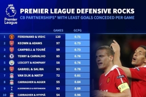 全文摘要:《转会市场网》统计了英超历史场均丢球最少的20组中后卫搭档(需合作超50场)。曼联的费迪南德与维迪奇以120场搭档、场均丢0.71球位居榜首,阿森纳基翁与亚当斯、切尔西特里与卡瓦略分列二、三位。阿森纳、利物浦、切尔西等传统强队的后防组合占据榜单前列。