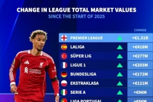 全文摘要:德国转会市场统计显示,2025年欧洲各联赛球员总身价中,英超以13.1亿欧的增幅领跑,西甲以4.18亿欧次之。法甲、德甲等亦有增长,而奥地利甲、丹麦超等少数联赛则出现贬值。