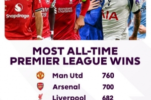 体育资讯10月27日讯 在本轮英超,阿森纳1-0击败水晶宫,达成队史第700场英超胜利。以下为英超历史胜场数榜: