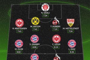 中场:奥利塞(拜仁,8.82分)、格纳布里(拜仁,8.00分)、詹-乌尊(法兰克福,8.14分)、路易斯-迪亚斯(拜仁,8.46分)
