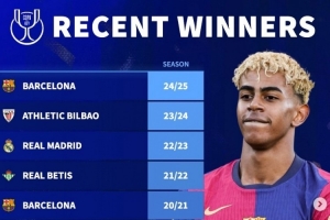 德转列近10年国王杯冠军: