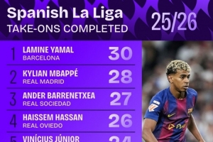 体育资讯10月29日讯 Squawka统计了本赛季球员在西甲的成功过人次数,并列出榜单,亚马尔、姆巴佩排名前两位。