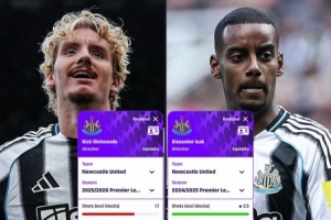 体育资讯10月30日讯 纽卡新援沃尔特马德在本赛季加盟后表现出色,在英超联赛6场打进4球。数据机构squakwa也对比他本赛季和伊萨克上赛季的英超场均关键数据,两人进球持平,而除了射门和传球数之外,沃尔特马德其他数据都更强: