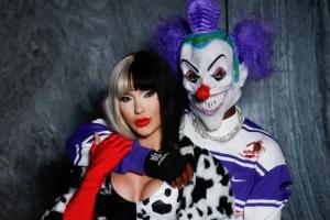 维尼修斯打扮成紫色的小丑,女友弗吉尼亚则cos了迪士尼动画《101忠狗》中的经典反派角色库伊拉,一同出cos的还有她与前夫的三个孩子。