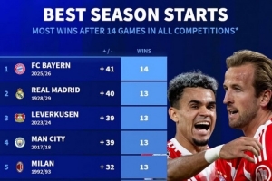 体育资讯10月31日讯 拜仁在昨晚德国杯4-1逆转科隆,赛季开局各项赛事14场全胜打破五大联赛球队历史纪录,《转会市场》也统计了五大联赛球队历史单赛季各项赛事前14场的胜场情况。