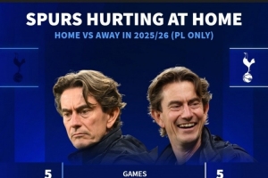 热刺本赛季英超主场战绩1胜1平3负,打进5球丢掉5球,客场4胜1平保持不败,打进12球仅丢3球。