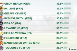 全文摘要:根据CIES统计,柏林联合以33.5%的由守转攻占比领跑五大联赛榜单,朗斯(33.3%)和赫塔费(32.7%)分列二、三位。数据显示,多支西甲球队表现突出,而英超曼联则以28.8%的占比位列榜单第九,反映出不同球队在攻防转换节奏上的战术差异。