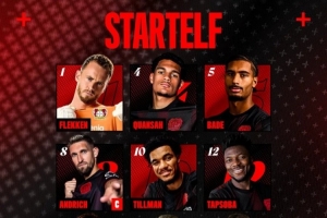 勒沃库森首发:1-弗莱肯、4-宽萨、5-巴代、8-安德里希、10-蒂尔曼、12-塔普索巴、14-希克、20-格里马尔多、21-巴斯克斯、23-内森-泰拉、25-帕拉西奥斯