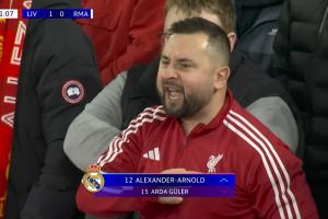 登场时,阿诺德遭到了红军球迷的“热烈欢迎”:安菲尔德嘘声四起,镜头给到的一位球迷向他手指着胸前的利物浦队徽,口中念念有词,随后这位球迷还低头亲吻了队徽。