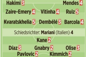 - 中场:扎伊尔-埃梅里,4分 / 维蒂尼亚,4分 / 法比安-鲁伊斯,5分