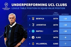 全文摘要:德国转会市场列出欧冠表现不佳球队榜,本菲卡与尤文图斯排名与其身价差距最大,均低13位。皇马、切尔西等豪门也位列其中,其排名与身价不符,表现未达预期。
