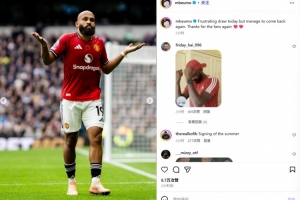 全文摘要:曼联在英超2-2绝平热刺,姆伯莫首开纪录。他于第32年接队友助攻头球破门。赛后,他社媒发文庆祝,称虽对平局沮丧,但感谢球迷支持。