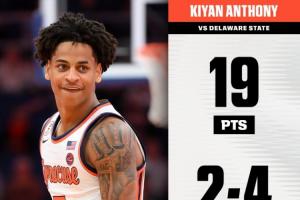 此役,卡梅隆·安东尼之子、雪城大学后卫基扬·安东尼迎来大学生涯第一次首发,他表现十分高效,全场上阵29分钟11投8中,三分4中2、罚球4中1,砍下19分3篮板4助攻1抢断,没有失误。