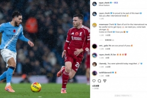 他也在赛后通过社媒晒出自己对位罗伯逊的比赛照,并配文:“很自豪成为这支球队的一员,我们国家队比赛周之后再见!”