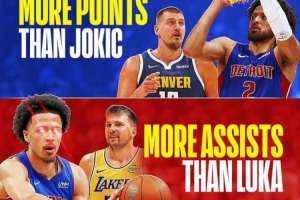 康宁汉姆场均25.6分>约基奇的25.2分;场均9.8次助攻>东契奇的9.5次;活塞目前8胜2负高居东部第一。