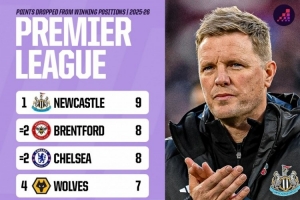 全文摘要:Opta统计显示,本赛季英超球队在领先情况下丢分情况突出。纽卡斯尔联以9分高居榜首,布伦特福德与切尔西同以8分并列次席。狼队、富勒姆和曼联紧随其后,均丢掉6分。此榜单反映出多支强队未能将领先优势转化为胜果,存在一定的稳定性问题。