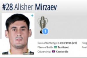 米尔扎耶夫现年29岁,司职中场,2019年1月前往柬埔寨联赛毗沙卡FC效力,已为球队出战82次,贡献5球7助攻,德转身价15万欧。根据国际足联官方消息,米尔扎耶夫的国际足联会籍已由乌兹别克斯坦转换为柬埔寨。