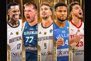 本届欧锦赛最佳阵容为:施罗德(德国)、小瓦格纳(德国)、申京(土耳其)、阿德托昆博(希腊)、东契奇(斯洛文尼亚)