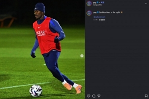 体育资讯11月21日讯 巴黎官方社媒晒照,努诺·门德斯参加训练。