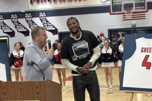 体育资讯11月21日讯 昨日,太阳后卫杰伦·格林的高中球衣退役仪式在圣华金纪念高中举行。