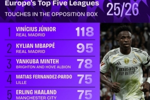 全文摘要:根据数据机构squakwa统计,五大联赛球员禁区内触球次数榜出炉。皇马的维尼修斯以118次位居榜首,力压队友姆巴佩(95次)。哈兰德与费尔南德斯·帕尔多以75次并列第五,亚马尔、拉什福德等知名球员也进入前十。