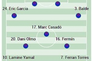 全文摘要:《阿斯报》预测巴萨首发对阵毕尔巴鄂竞技。门将加西亚;后卫由埃里克、阿劳霍、库巴西、巴尔德组成;中场为奥尔莫、卡萨多、费尔明;锋线则派出亚马尔、莱万和费兰·托雷斯。比赛将于北京时间今晚23点15分进行。