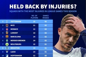 全文摘要:德国转会市场统计显示,本赛季五大联赛球队伤病情况严峻。热刺以15人次累计伤缺92场高居榜首,巴萨14人次伤缺62场排名第五。伤病潮已对多队赛季表现造成严重影响。