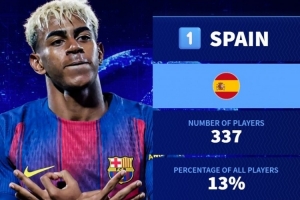 体育资讯9月16日讯 德国转会市场统计了五大联赛各国球员的数量,并列出榜单,西班牙337人居首。