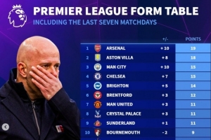 英超各队最近7轮联赛得分:阿森纳19分居首,利物浦仅3分倒数第二