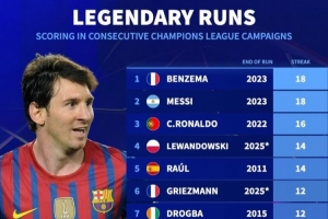 全文摘要:根据《转会市场》统计,梅西与本泽马以18赛季的欧冠连续进球纪录并列榜首。C罗以16赛季位列第三,莱万多夫斯基、姆巴佩等球星紧随其后,部分纪录仍在延续。