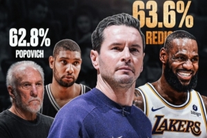 美媒Basketball Forever:雷迪克目前执教战绩63胜36负,胜率63.6%高于波波维奇的62.8%(1390胜824负);在雷迪克的带领下,湖人队在前三节领先的情况下战绩为57胜4负,是NBA历史上最好的战绩。
