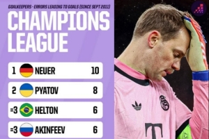体育资讯11月27日讯 在本轮欧冠,阿森纳3-1击败拜仁,诺伊尔出击失误导致丢球。数据网站OPTA也盘点了自2011年9月以来欧冠赛场门将因失误导致丢球榜单,具体如下: