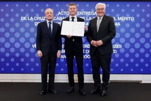 在伯纳乌荣誉包厢举行的仪式上,克罗斯被授予德国功绩勋章骑士十字勋章。德国总统施泰因迈尔亲自为这位皇马传奇和世界足坛巨星颁发了这一荣誉。出席授勋仪式的还有皇马名誉主席何塞·马丁内斯·皮里、机构关系总监布特拉格诺、主帅阿隆索、球员巴尔韦德、吕迪格,以及皇马传奇球员罗伯托·卡洛斯、阿韦罗亚和索拉里。