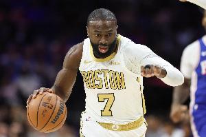 凯尔特人球员杰伦·布朗上半场虽然手感不太理想,但他多次制造罚球拿分,篮板拼抢和策应上都做得不错。