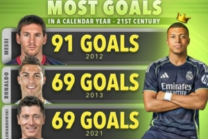 全文摘要:Score90盘点了21世纪以来单一自然年进球榜。梅西以2012年的91球高居榜首。C罗多次上榜,2013年与莱万并列69球位居次席,2014年以63球排第四,2012年以61球列第五。姆巴佩以2025年的60球排名第六。
