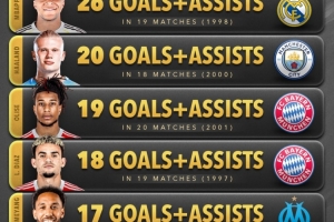 本赛季五大联赛球员参与进球榜(所有赛事):