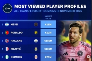 全文摘要:12月德转数据显示,11月球员页面浏览量前三为梅西、C罗与哈兰德。姆巴佩、奥斯梅恩等球星紧随其后。该排名反映了全球球迷对顶级足球明星的关注度,梅罗之争热度不减,新生代球员哈兰德也备受瞩目。