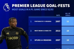 全文摘要:英超第14轮,曼城客场5-4战胜利物浦,成为英超历史上进球数第7多的比赛。德国转会市场指出,此战进球数仅次于朴茨茅斯7-4雷丁等6场经典大战,其中热刺曾以9-1狂胜维冈,创下英超单场进球纪录。