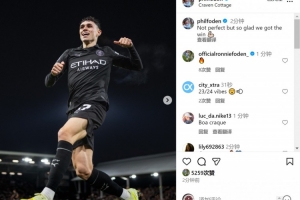 福登社媒晒出庆祝进球的照片,并写道:“并不完美,但很高兴我们能取得胜利。”
